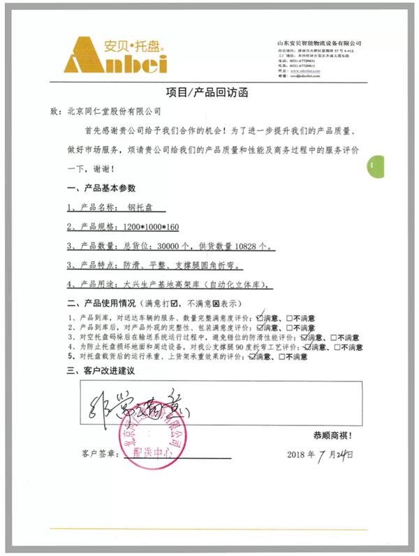 PA电子为北京同仁堂药业立体库项目的30000个货位配套了钢托盘产品,得到了北京同仁堂领导的高度评价