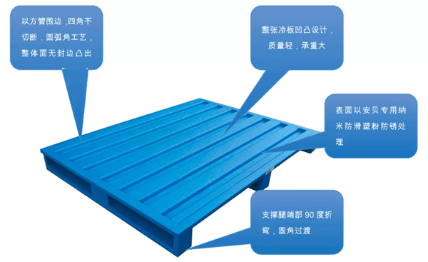 通过钢板几何变形设计,有效的增加承重,同时节约用料,让钢托盘轻而承重,更方便搬运。
