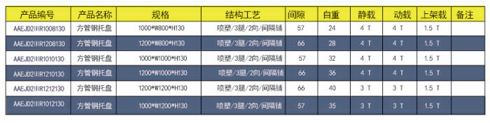 四向三腿——CM深槽板间隔铺面 技术参数说明: 产品编号: AATJD4ⅢC1212150 产品名称:CM面板川字钢托盘 产品规格: 1200*1200*150 产品自重: 34kg 防锈工艺: 静电沙纹喷塑 产品静载: 3000KG(均匀载重) 产品动载: 2000KG(均匀载重) 产品上架: 1200KG(均匀载重) 主要用途: 配合穿梭货架、立体仓库、车间周转、物流仓储