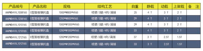 四向三腿——C型面板钢托盘 技术参数说明: 产品编号: AAPMD4ⅢL1210165 产品规格: 1200*1000*165 产品自重: 33kg 防锈工艺: 静电沙纹喷塑 产品静载: 3000KG(均匀载重) 产品动载: 2500KG(均匀载重) 产品上架: 1500KG(均匀载重) 主要用途: 仓库、车间周转、物流仓储
