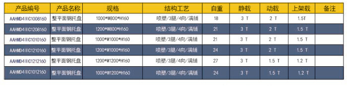 四向三腿——整平面钢托盘 技术参数说明: 产品编号: AAHMD4ⅢH1210160 产品名称: 整平板川字钢托盘 产品规格: 1200*1000*160 产品重量: 24kg 产品静载: 4000KG(均匀载重) 产品动载: 2000KG(均匀载重) 产品上架: 1500KG(均匀载重) 防锈工艺: 静电沙纹喷塑 主要用途: 仓库、车间周转、物流仓储