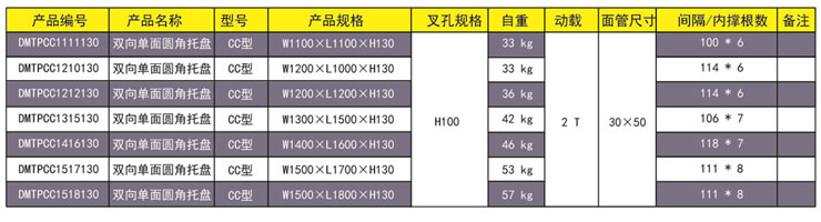 CC型—双向单面圆角托盘 产品用途:主要为袋装的软包装大批量物品存储和周转。改变老式四个尖角焊接,采用圆角工艺,主要防止麻袋在放置时不容易刮破。